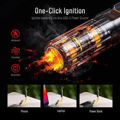 Need fire instantly? Simply plug Prometheus into any USB-C power source and press the ignition button to create a windproof flame in just one second. Perfect for lighting grills, campfires, candles, or cigarettes—no gas, no refills, just pure USB power.