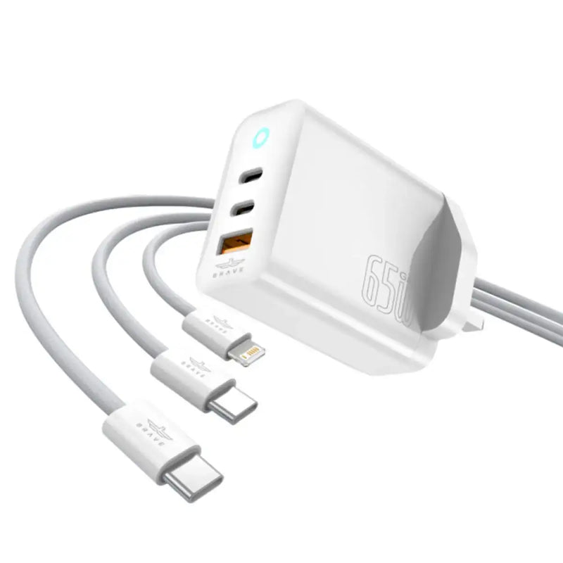 اسم: شاحن Brave للكمبيوتر المحمول PD GaN ثلاثي المنافذ بقوة 65 وات - منفذ مزدوج من النوع C + USB-A مع كابلات من النوع C إلى C بقوة 60 وات وكابلات من C إلى Lightning بقوة 20 وات - أبيض