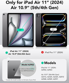 Compatibility: only for iPad Air 11 Inch M2(2024) and iPad Air 6/5/4 (2024/2022/2020); models: Air 11":A2902, A2903, Air 10.9": A2316, A2324, A2325, A2072, A2588, A2589, A2591; not compatible with any other iPad models