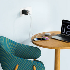 With two USB-C ports and one USB-A port, this multi-port charger intelligently distributes power based on connected devices, ensuring fast and safe charging without slowdown.