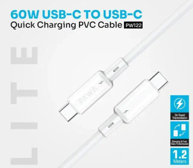 PW-BDC312CC-WH | PAWA Lite 60W TypeC to TypeC Quick Charging PVC Cable 1.2M PW122 | White - GulfStore.com
