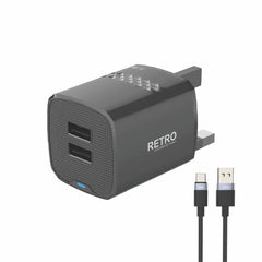 PAWA Retro 3.1A Dual USB Travel Adapter with Type-C Cable – UK Plug (Black)