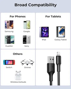 In addition to fast charging, the cable supports up to 480Mbps data transfer speeds. This allows you to sync music, videos, photos, documents, and apps between your Apple device and your computer quickly and efficiently.
