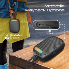 Designed with durability and style in mind, the speaker is constructed from high-quality ABS plastic with a premium metallic spray finish, giving it a sleek and modern black appearance while remaining rugged enough for daily use. Three dynamic RGB light modes add visual energy and rhythm to your music, enhancing the atmosphere during night use, parties, or relaxing sessions.