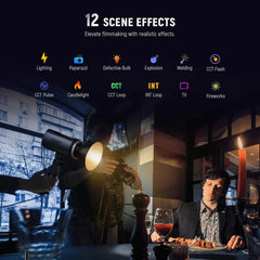 Full Color Control: Adjustable color temperature (2700K–6500K) and brightness (0–100%), with 12 built-in scene effects for creative video and photography applications.