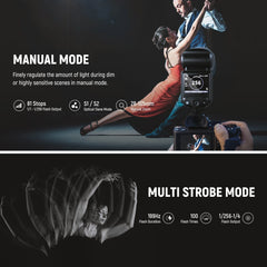 Supports stroboscopic flashes, HSS (High-Speed Sync), and manual dimming