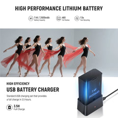 7.2V / 3000mAh lithium battery delivers up to 600 full-power flashes