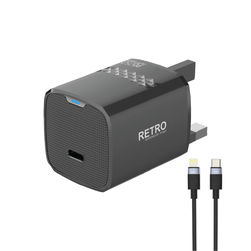 PAWA Retro 25W Fast Charger with USB-C Port & Type-C to Lightning Cable – UK Plug (Black)