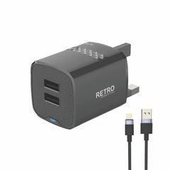 PW-TCR31UKL-BK | PAWA Retro 3.1A Dual USB Travel Adapter with UK Plug & Lightning Cable – Black