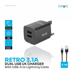 PW-TCR31UKL-BK | PAWA Retro 3.1A Dual Usb Travel Adapter With UK Plug With Lightning Cable | Black