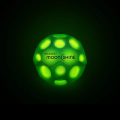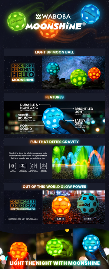 Goodnight sunshine, hello Moonshine! Play in the dark, because it’s a full Moon every night with Waboba Moonshine. Our light up Moon Ball is slightly smaller, but lightyears ahead in fun. Bounce to activate the light. The LED light in the Moon Ball stays lit for 7 seconds. Light the night and choose between three LED Moon Ball ball colors: blue, orange, and green.